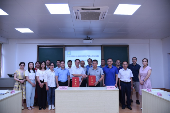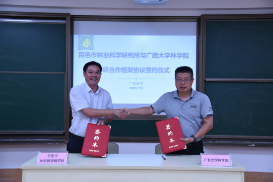 百色市林业科学研究所副所长黄日正、william威廉中文官网杨梅副经理及到会人员就双方的合作领域、合作形式及保障措施等方面进行深入探讨与交流。随后,双方签订了产学研合作框架协议,将在科学研究、技术创新、成果转化和人才培养等领域开展全面合作。