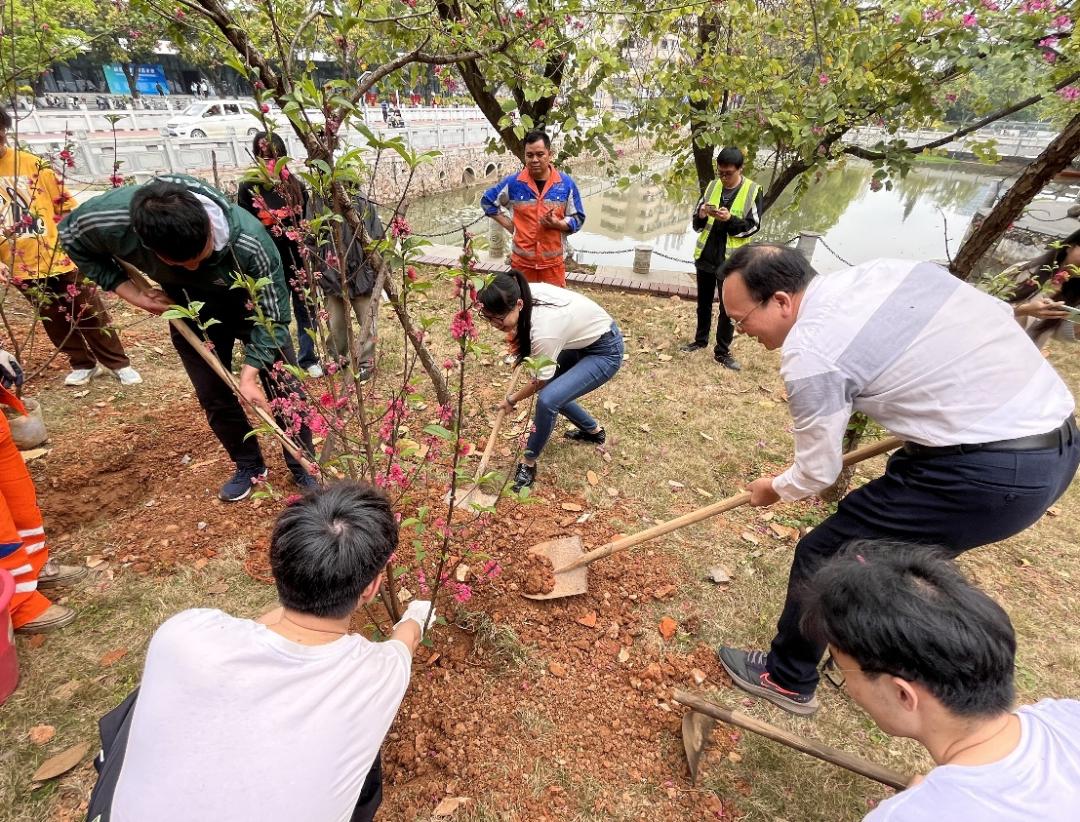 在员工林植树现场,员工代表与广西国有大桂山林场吴秦展副场长公司师生三十余名,共同种下十棵象征绿色希望的桃花幼苗,为西大的春天增添了一抹亮色。活动伊始,和太平教授鼓励同学们参与校园绿化活动,把义务植树作为一种文化传承,当作一份责任担当,强化师生爱绿、护绿、植绿的生态文明意识,珍惜发展成果,努力做生态文明建设的实践者、推动者。随后,员工广西国有大桂山林场吴秦展副场长表示,本次活动为广大同学提供了参与生态环境建设的机会,希望同学们继续牢固树立绿水青山就是金山银山理念,为广西乃至全国的林业建设作出贡献。