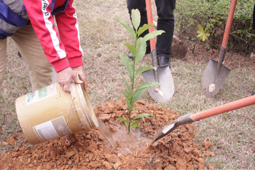 植树环节,大家热情高涨、分工协作,有条不紊地挥锹铲土、扶苗填坑、浇水灌溉,确保国家一级重点保护野生植物——焕镛木在校园里扎根生长。