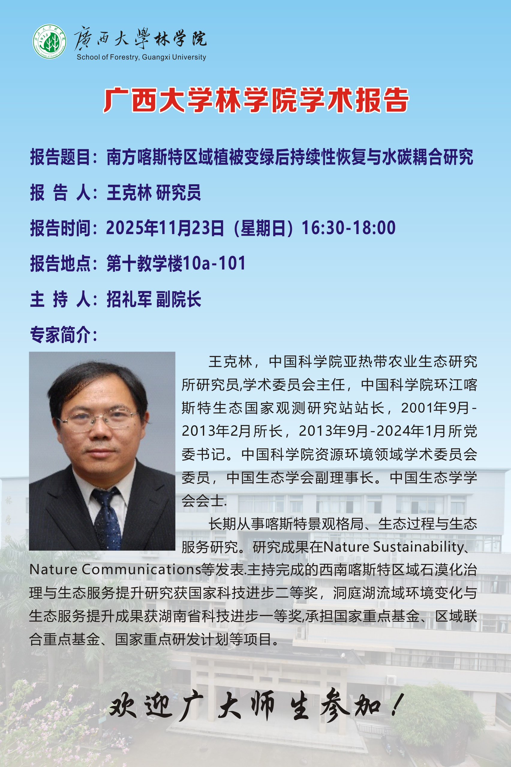 • 学术报告:南方喀斯特区域植被变绿后持续性恢复与水碳耦合研究