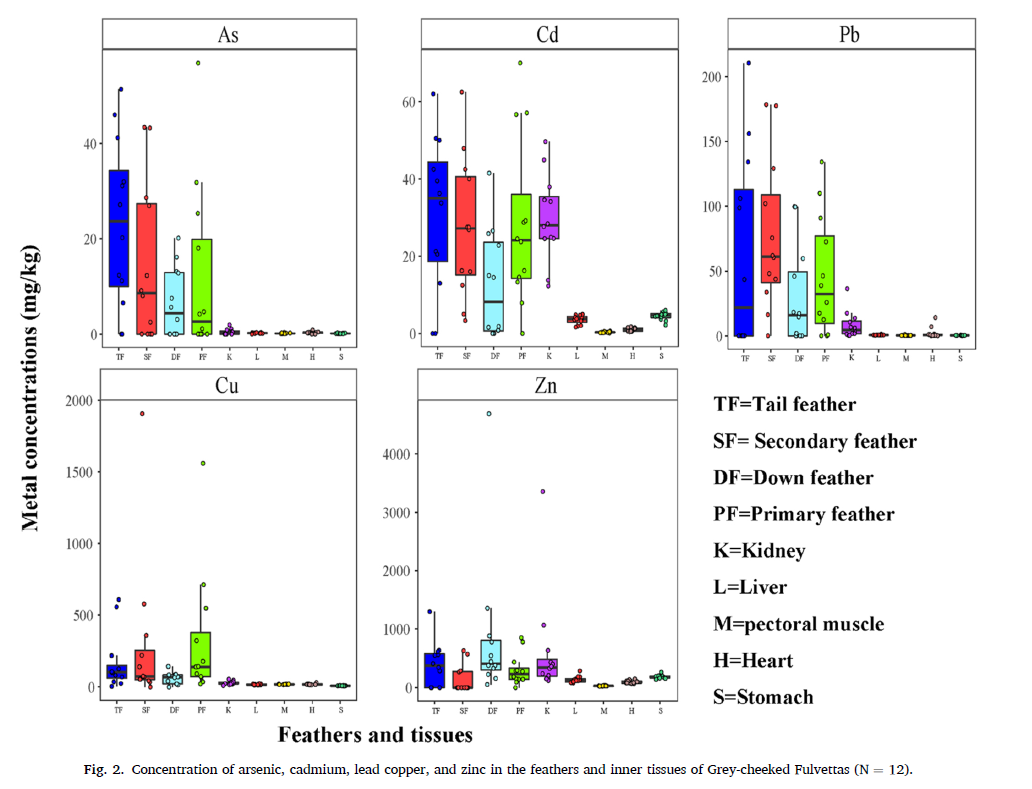 相关研究成果以“Multiple trace elements exposure of Grey-cheeked Fulvettas Alcippe morrisonia, a nuclear member in bird mixed-species flocks, and implications for bioindicator”为题于今年9月发表于国际学术期刊《Ecotoxicology and Environmental Safety》(环境科学与生态学2区TOP期刊,IF=7.13)上。博士生刘士龙为第一作者,蒋爱伍副教授为该研究论文的通讯作者。博士生Wambura M. Mtemi、硕士生周天龙和本科生潘金城参加了部分研究工作。该项研究获国家自然科学基金(31870370)和广西自然科学基金重点项目(2018GXNSFDA281016)资助。