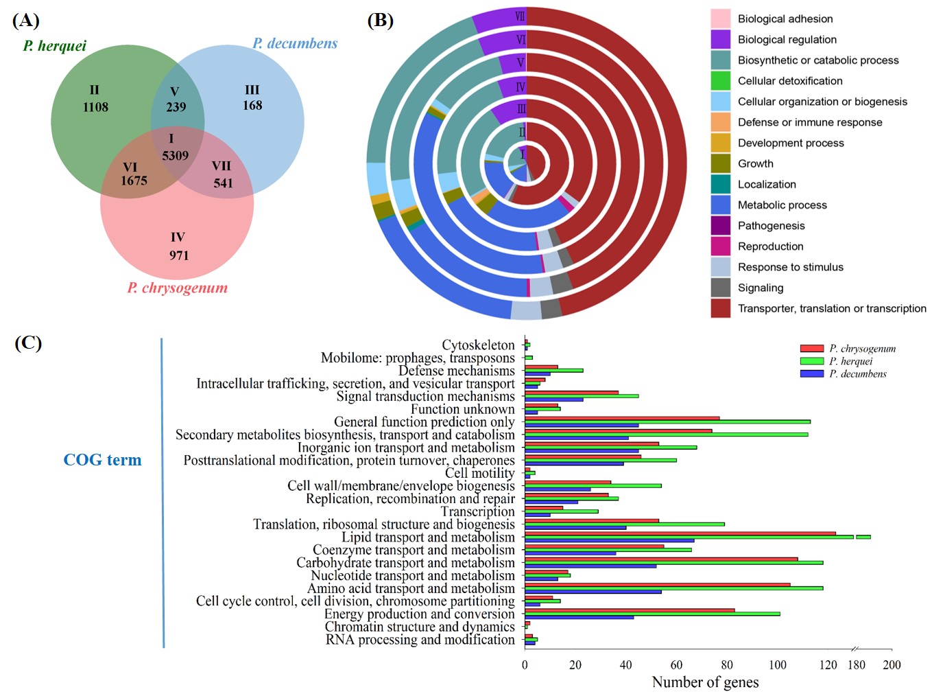 三种青霉菌P. herquei、P. chrysogenum、P. decumbens间共有和特有基因家族