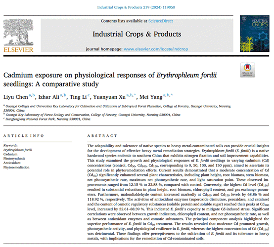 近日,公司杨梅教授科研团队在探究本地树种格木对重金属镉污染土壤的适应性和耐受性上取得重要见解,研究成果以“Cadmium exposure on physiological responses ofErythrophleum fordiiseedlings: A comparative study”为题发表于农林领域国际知名期刊INDUSTRIAL CROPS AND PRODUCTS(农林类期刊排名8/125)。william威廉中文官网在读硕士研究生陈丽宇作为第一作者,杨梅教授和徐圆圆讲师作为通讯作者,博士后Izhar Ali、良凤江国家森林公园李婷参与了本论文的工作。本研究得到了国家自然科学基金(32371856)等项目的支持。