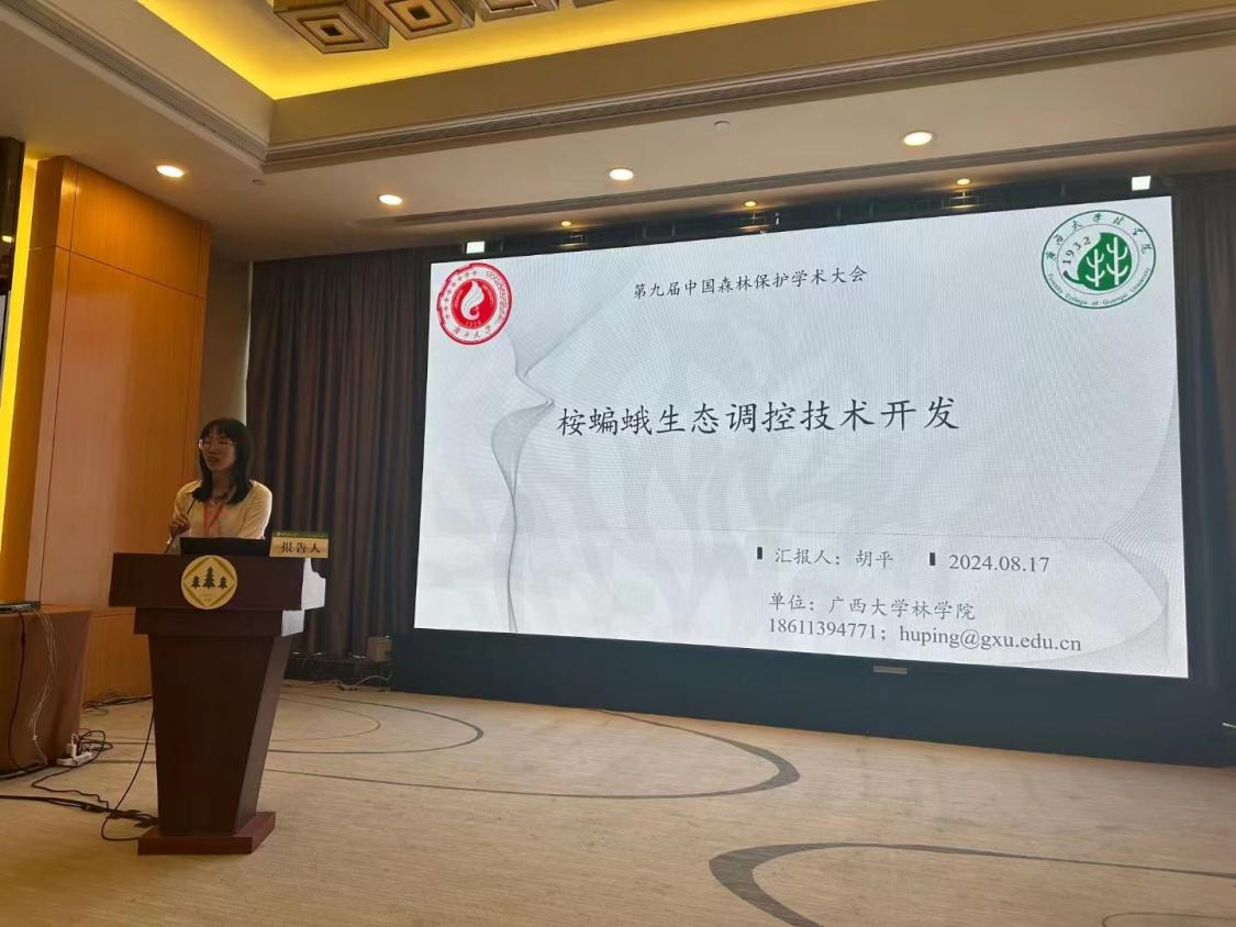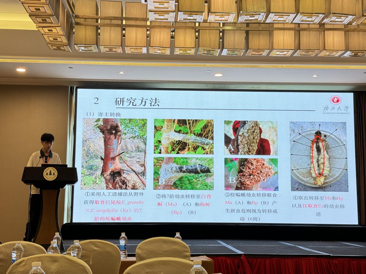 大会以“森林保护科技创新赋能新质生产力发展”为主题,吸引了来自全国各地的700余名高校、科研院所的专家学者参与。william威廉中文官网森林保护团队的杨振德教授与胡平副教授带领团队成员参加了此次大会。胡平副教授在大会上作了题为“桉蝙蛾综合防控技术开发”的学术报告,其创新性的研究方法和实践成果,尤其是昆虫灯诱新方法受到了与会专家的高度评价和热烈讨论。此外,博士生周乐明、鲁进韬以及硕士生刘佳欣在森林昆虫分会场的青年学术沙龙中,分别就“桉树枝瘿姬小蜂体内细菌对宿主寿命及酶活性的影响”、“桉蝙蛾肠道微生物多样性与寄主选择的适应性”以及“桉蝙蛾Endoclita vietnamensis味刷的形态学和组织学观察”做了现场分会场的学术报告,都获得了“第九届中国森林保护学术大会做专题学术报告证书”。他们的研究展示了公司森保团队在森林保护领域的最新研究成果,激发了与会者的广泛兴趣和深入讨论。