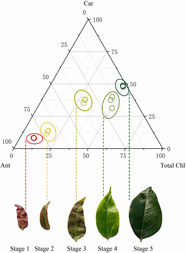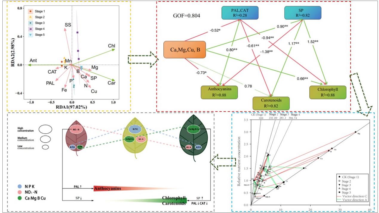 在叶片生长和变色过程中,营养元素含量与相对浓度的比值呈上升下降相互交替的趋势,“上升趋势”表明当前养分缺乏限制了叶片的生长,因此植物通过提高叶片对营养元素的吸收效率以缓解该阶段的元素缺乏。随着养分元素含量增加,营养元素逐渐从缺乏到充足,继续增加则超过叶片需求,此时叶片通过生长来稀释这些元素,在该过程中,元素的相对浓度下降,但相对含量继续增加,此过程即为“下降趋势”。叶片元素营养水平下降到亏缺状态时,又限制了叶片的生长。此时,叶片即将再次通过叶片对营养的吸收效率以缓解元素缺乏,上述元素“汇集-稀释-再汇集-再稀释”(对应“上升-下降-再上升-再下降”)的权衡关系,是植物自身响应养分丰缺程度的一种调节机制,在叶片生长和转色的过程中发挥重要作用,了解这些将对叶片颜色调控有实际指导意义。