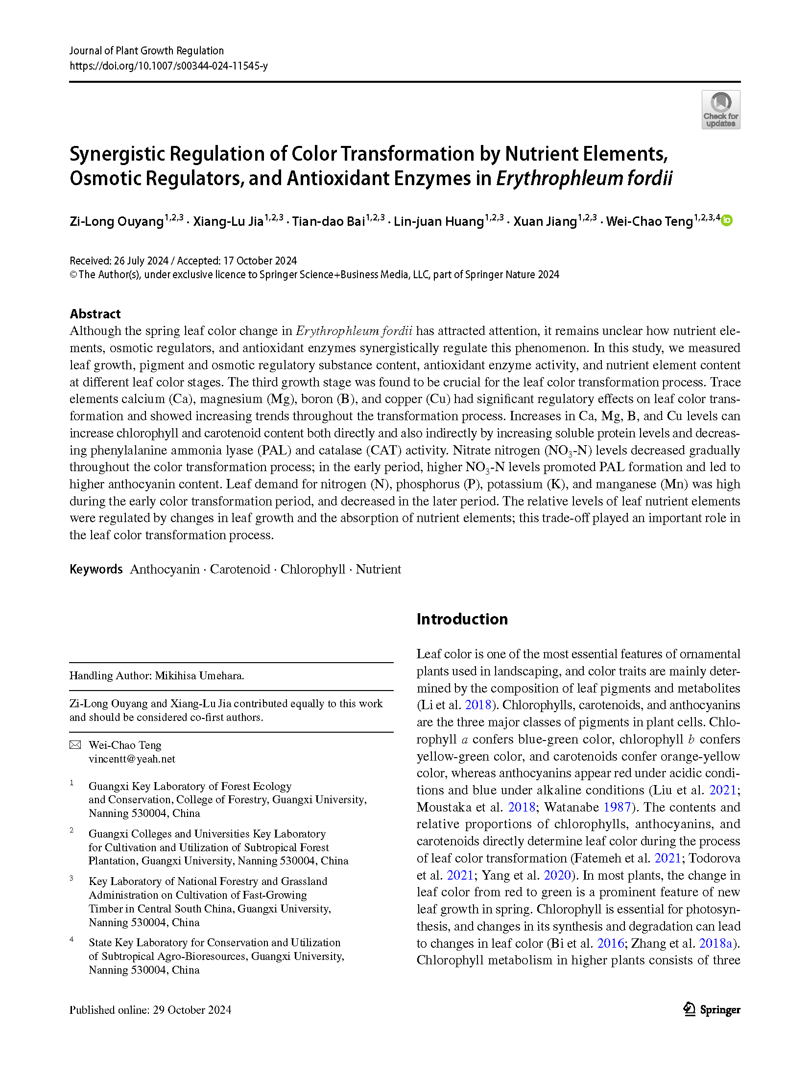 近日,公司滕维超团队在国家二级重点保护植物格木叶色变化机理上取得重要发现,研究成果以“Synergistic Regulation of Color Transformation by Nutrient Elements, Osmotic Regulators, and Antioxidant Enzymes inErythrophleum fordii”为题在国际期刊Journal of Plant Growth Regulation发表。
