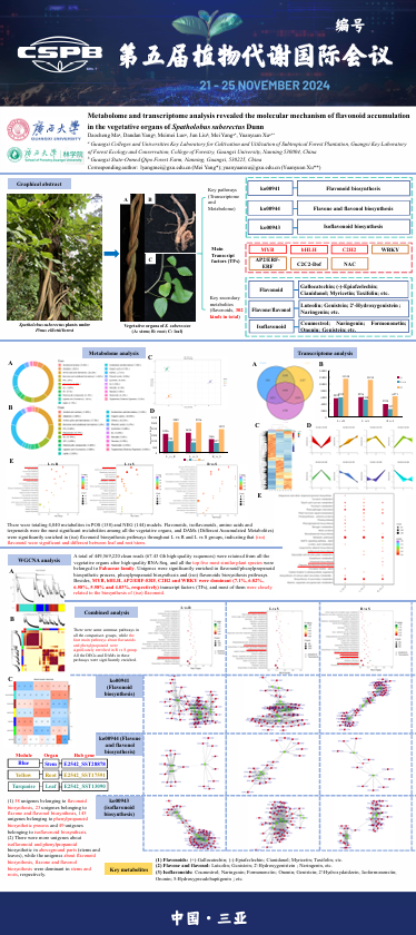 博士研究生马道承以“Metabolome and transcriptome analysis revealed the molecular mechanism of flavonoid accumulation in the vegetative organs ofSpatholobussuberectusDunn”为题制作墙报。该研究介绍了松树林下鸡血藤(Spatholobussuberectus)不同营养器官(根、茎、叶)中类黄酮的积累特性,并从代谢组、转录组的角度进行关联分析,找出鸡血藤不同器官类黄酮积累的规律及特征,发现类黄酮、异黄酮等物质在不同器官之间存在显著差异。差异基因则显著富集于类黄酮生物合成(Flavonoids biosynthesis)、异黄酮生物合成(Isoflavonoidsbiosynthesis)、苯丙烷生物合成(Phenylpropanoidbiosynthesis)等信号通路中。各器官中C2H2、MYB、bHLH为主要的转录因子,这些转录因子与类黄酮的生物合成相关。总体上茎、叶部分异黄酮、苯丙烷生物合成的相关基因较多,茎、根中类黄酮生物合成、黄酮和黄酮醇生物合成基因较多。这对鸡血藤未来的药用成分高效利用、定向培育等方面提供参考依据。