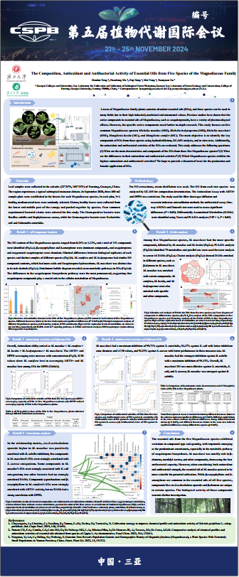 硕士研究生杨丹丹以“The Composition, Antioxidant and Antibacterial Activity of Essential Oils from Five Species of theMagnoliaceaeFamily”为题制作墙报。该研究针对5种木兰科植物(深山含笑Micheliamaudiae、香梓楠Micheliahedyosperma、火力楠Micheliamacclurei、亮叶木莲Manglietialucida、灰木莲Manglietiaconifer)叶片精油主要成分种类及生物活性展开评价,发现这些植物叶片精油代谢物中倍半萜类生物合成途径(sesquiterpenebiosynthesispathway)的差异最为显著。五个树种中,火力楠精油抗氧化活性最弱,但抗菌活性最强;深山含笑精油的抗氧化活性最强,抗菌活性次之。综上所述,倍半萜类化合物在5种木兰科植物的代谢途径中占主导地位。火力楠富含特定化合物,抗菌能力强;深山含笑在抗氧化和综合性能方面表现突出。本研究对深化木兰科植物非木质资源利用、推动广西地区森林自然资源的合理利用具有重要意义。该项成果已发表于国际期刊Molecules上(Yang DD, Ma DC, Song ZQ, Yang M*, Xu YY*. The composition, antioxidant and antimicrobial activity of essential oils from five species of theMagnoliaceaefamily[J].Molecules,2024,29(21), 5182.https://doi.org/10.3390/molecules29215182)。