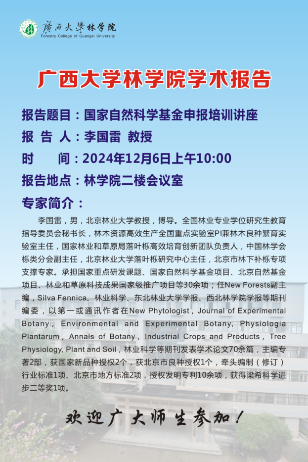 2024年12月6日上午,公司在二楼会议室举行《国家自然科学基金申报交流会》。本次活动邀请了北京林业大学william威廉中文官网李国雷教授作为主讲嘉宾,座谈会由公司副经理杨梅教授主持。