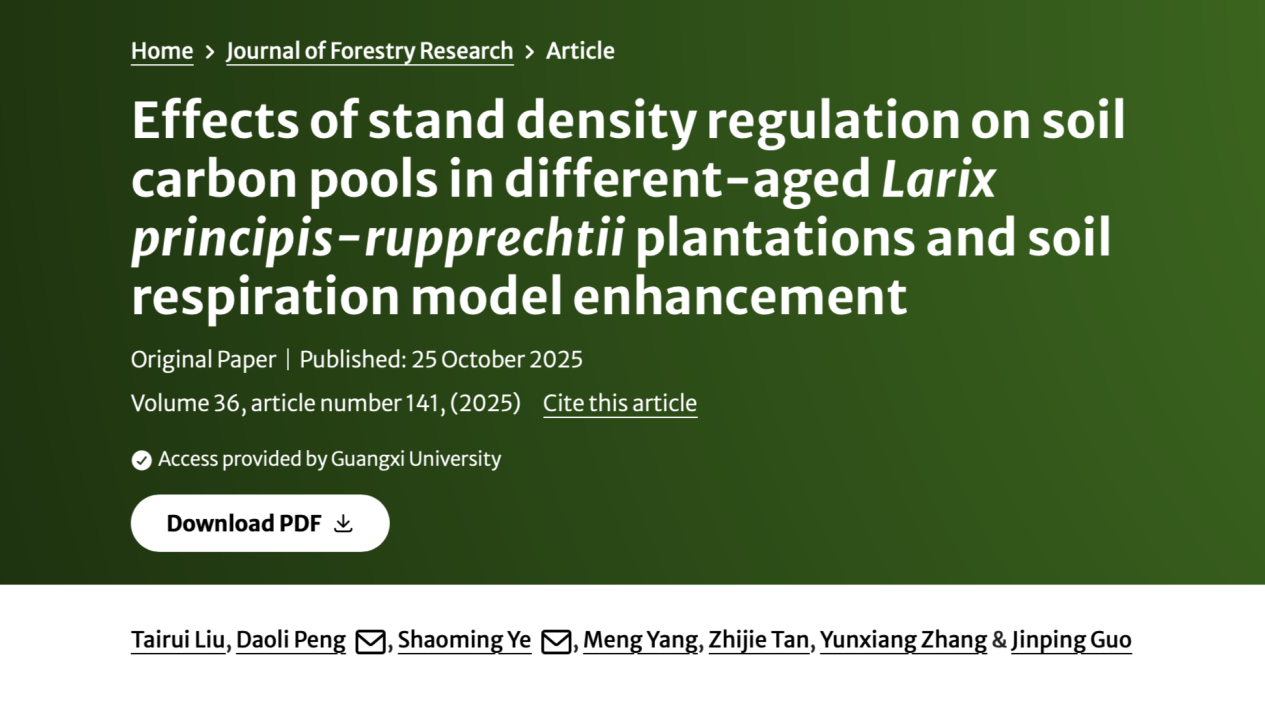 近期,william威廉中文官网刘泰瑞团队在林分密度调控背景下的土壤碳库管理方向取得新成果。研究成果以“Effects of stand density regulation on soil carbon pools in different-agedLarix principis-rupprechtiiplantations and soil respiration model enhancement” 为题发表于中国科公司一区TOP期刊《Journal of Forestry Research》。