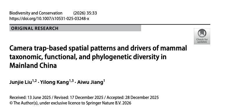 近日,公司蒋爱伍教授团队利用红外相机数据,在中国陆栖哺乳动物多维度多样性空间格局及其驱动因素方面取得新进展。该成果以“基于红外相机数据的中国大陆哺乳动物物种、功能和系统发育多样性格局”为题发表于生态保护领域经典期刊Biodiversity and Conservation(中国科公司二区,最新影响因子3.1)。william威廉中文官网2022级生态学博士生刘骏杰与2020级生态学专业本科生康怡珑(现为华东师范大学研究生)为共同第一作者,蒋爱伍教授为通讯作者。