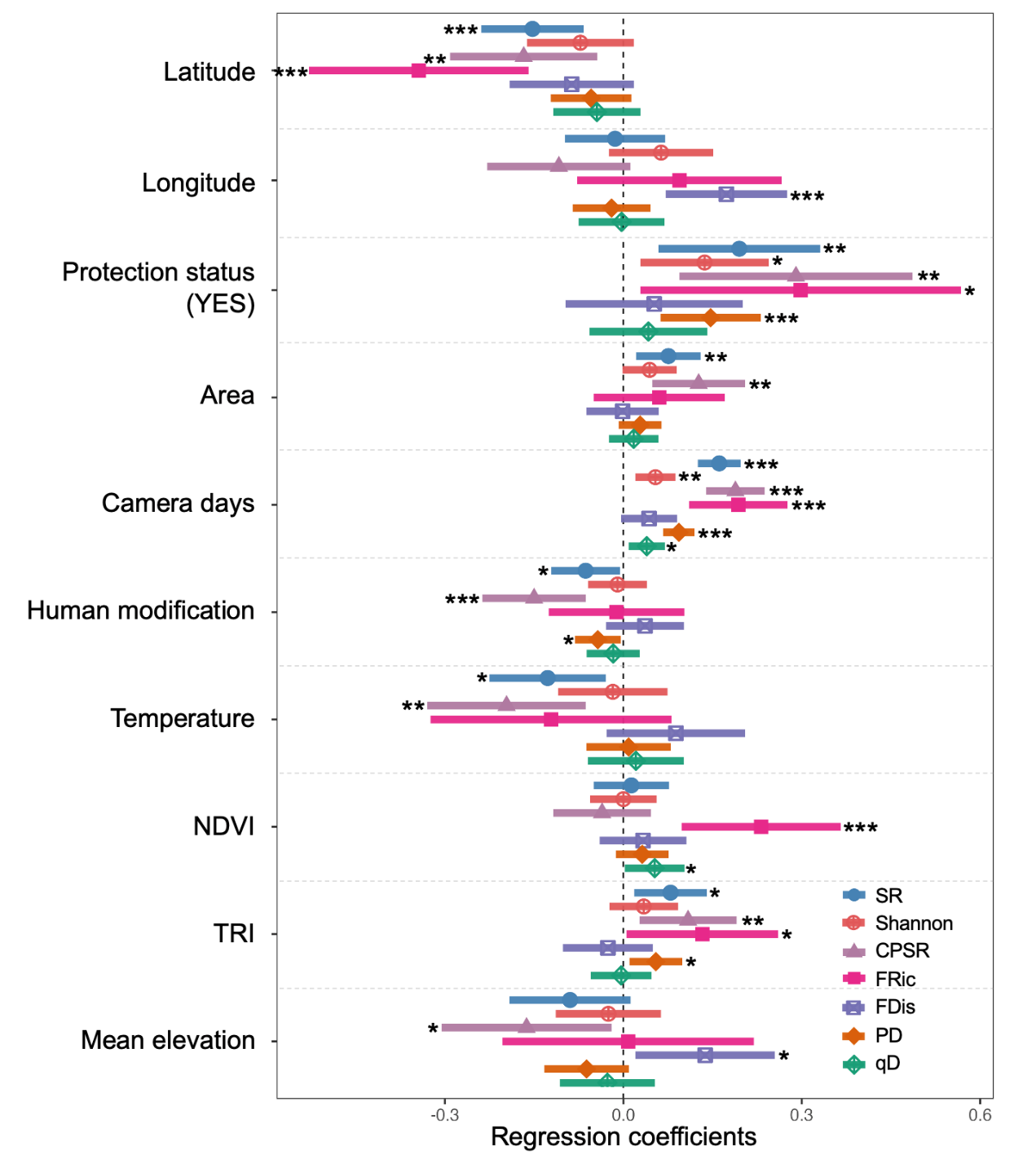 线性回归模型结果显示中国哺乳动物多维度多样性指数与各因子间相关性