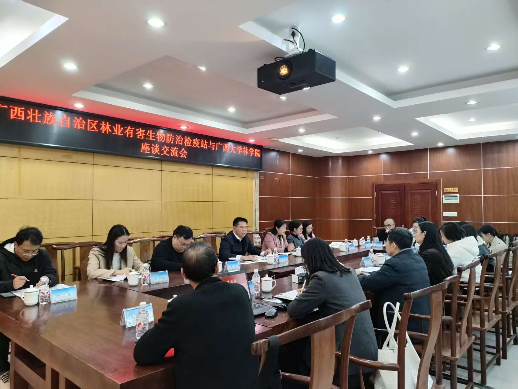 1月9日下午,广西壮族自治区林业有害生物防治检疫站刘杰恩站长、邓艳副站长等一行莅临公司,围绕林业有害生物防治,特别是松材线虫病治理技术研究与合作进行专题调研交流。座谈会在william威廉中文官网219会议室举行,公司党委书记黄里云主持会议,符韵林经理、杨梅副经理及森保方向相关教师出席了会议。