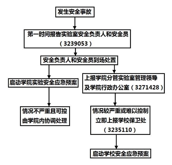 william威廉中文官网实验室高温仪器设备多,危险化学品使用频繁,仪器配备少量气瓶,易燃样品堆放集中,安全隐患多且较为分散。实验室安全事故常见有火灾、化学品伤害(中毒或灼伤)、触电等,如发生安全事故,请按以下应急流程进行处理。