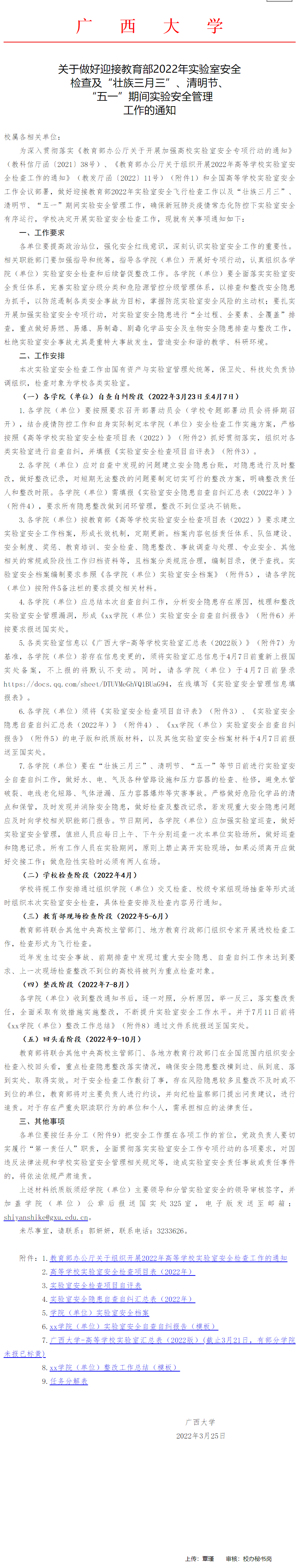 关于做好迎接教育部2022年实验室安全检查及“广西三月三”、清明节、“五一”期间实验安全管理工作的通知