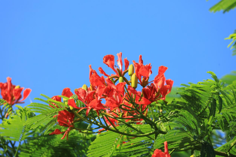 凤凰木最惊艳之处,当属其花期。每年5-7月,凤凰木便成了花的海洋,一朵朵花鲜红夺目,花瓣边缘呈波浪状,花蕊细长探出,犹如火焰般热烈奔放。远远望去,满树红花与绿叶相互映衬,叶如飞凰之羽,花若丹凤之冠,犹如天边绚丽的晚霞,又似燃烧的火焰,极为壮观。
